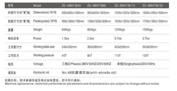 本机分40吨、80吨、110吨、130吨规格(压力)。抽屉式工作台,装有安全装置,操作时安全又方便。本机具有压力大、速度快、压花质量好等优点上下工作面板均可加热,温度可独立控制,下电热板可按需求进行拆装。