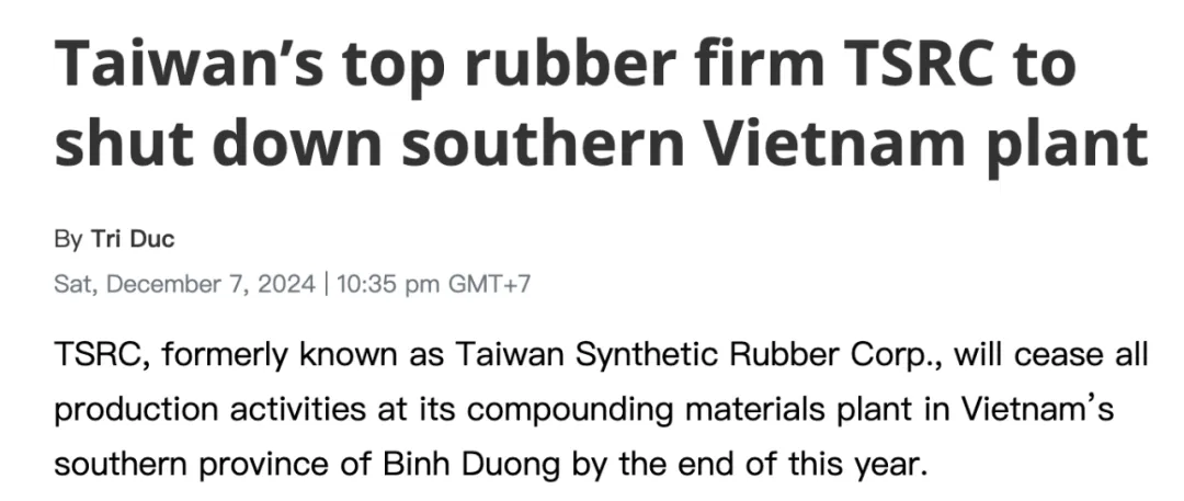 台橡(台湾合成橡胶股份有限公司)将于今年(2024)年底停止位于越南南部平阳省复合材料工厂的所有生产活动。