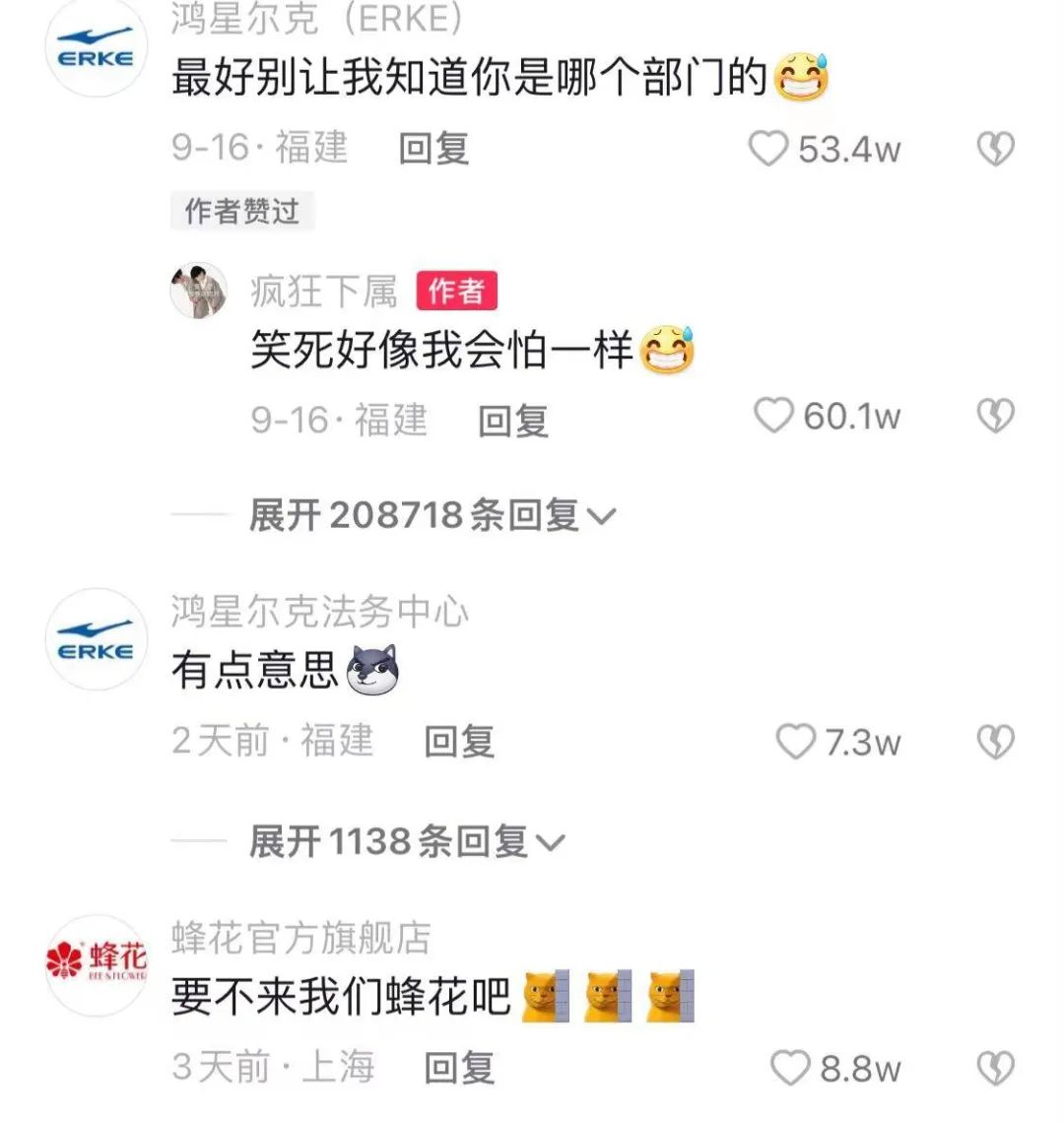 鸿星尔克抖音账号名为“疯狂下属”的职员,贴上“整顿职场”标签的作品一经发布,就引来了无数网友围观。同时,鸿星尔克官方账号亲自下场“对峙”,在作品底下评论道,“最好别让我知道你是哪个部门的”,却遭作者回复“笑死好像我会怕一样”。