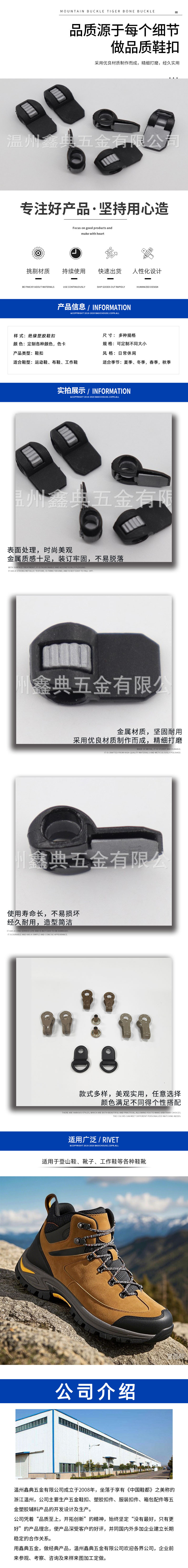 • 主营业务:温州鑫典五金有限公司成立于2008年,座落于享有《中国鞋都》之美称的浙江温州,公司主要生产五金鞋扣、塑胶扣件、服装扣件、箱包配件等五金塑胶辅料产品的开发设计及生产