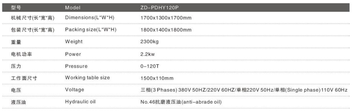 Fixed 5 oil cylinder, pressure range of 0-120 tons;The machine install pressure maintaining system, motor will idling running whenpressure to the setting value keep well for motor and pump;Electric system adopt the control of PLC with operating system with touch screenand graphical, to make the circuit more accurate. Parameter can be memorized;