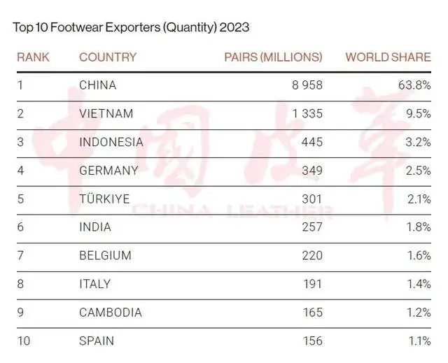 越南和印度尼西亚则分别以9.5%和3.2%的占比紧随其后,共同构成了全球鞋类出口的重要力量。
