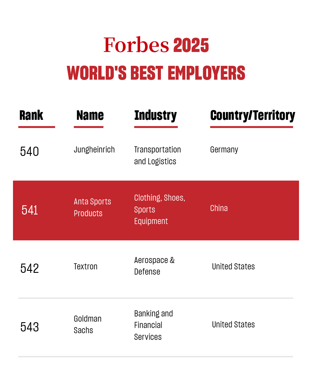 安踏五登福布斯全球最佳雇主!