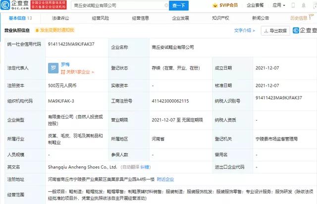 商丘安诚鞋业有限公司成立于2021年12月7日,法定代表人为罗梅,注册资本为500万元,经营范围包括鞋制造;鞋帽批发;鞋帽零售;制鞋原辅材料销售;服装制造;服装服饰批发等。该公司由任彪持股62%,罗梅持股20%,商丘安踏鞋业有限公司持股18%。