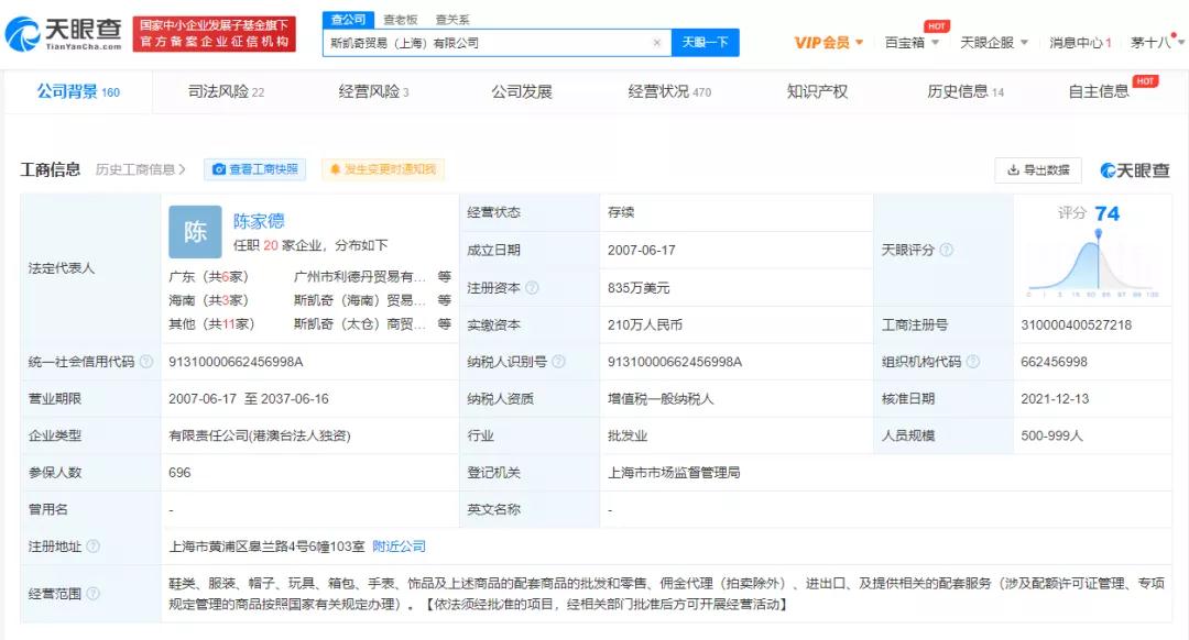 斯凯奇贸易(上海)有限公司成立于2007年6月,法定代表人为陈家德,经营范围含批发零售鞋类、服装、箱包等。