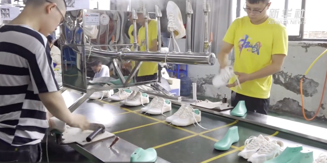 在鸿星尔克成型车间的彭玉红2020年4月份回到家乡工作。“一天能出3000双鞋子,不担心没活干。”她说,今年还把弟弟介绍到贴底车间工作。