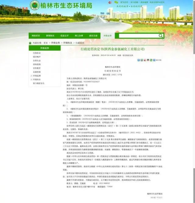 榆林市生态环境局发布了对陕西金泰氯碱化工有限公司的行政处罚(陕K环罚〔2022〕137号),行政处罚决定书显示,该企业因涉嫌检测报告弄虚作假,被罚款3万元。