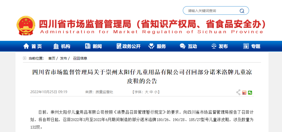 据四川省市场监督管理局网站近日消息,崇州太阳仔儿童用品有限公司按照《消费品召回管理暂行规定》的要求,向四川省市场监督管理局报告了召回计划,将自即日起,召回2022年3月至2022年6月期间制造的部分诺米洛牌180/26、190/28、185/27型号儿童凉皮鞋,涉及数量为132双。